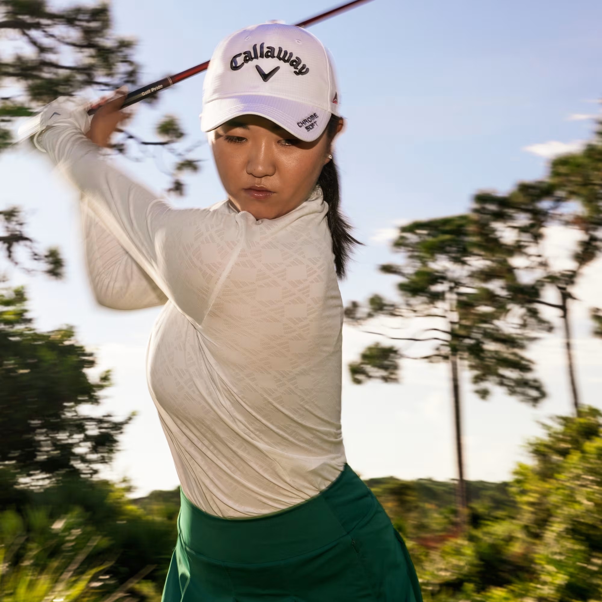 Chiếc áo golf cổ đứng làm từ chất liệu tái chế.